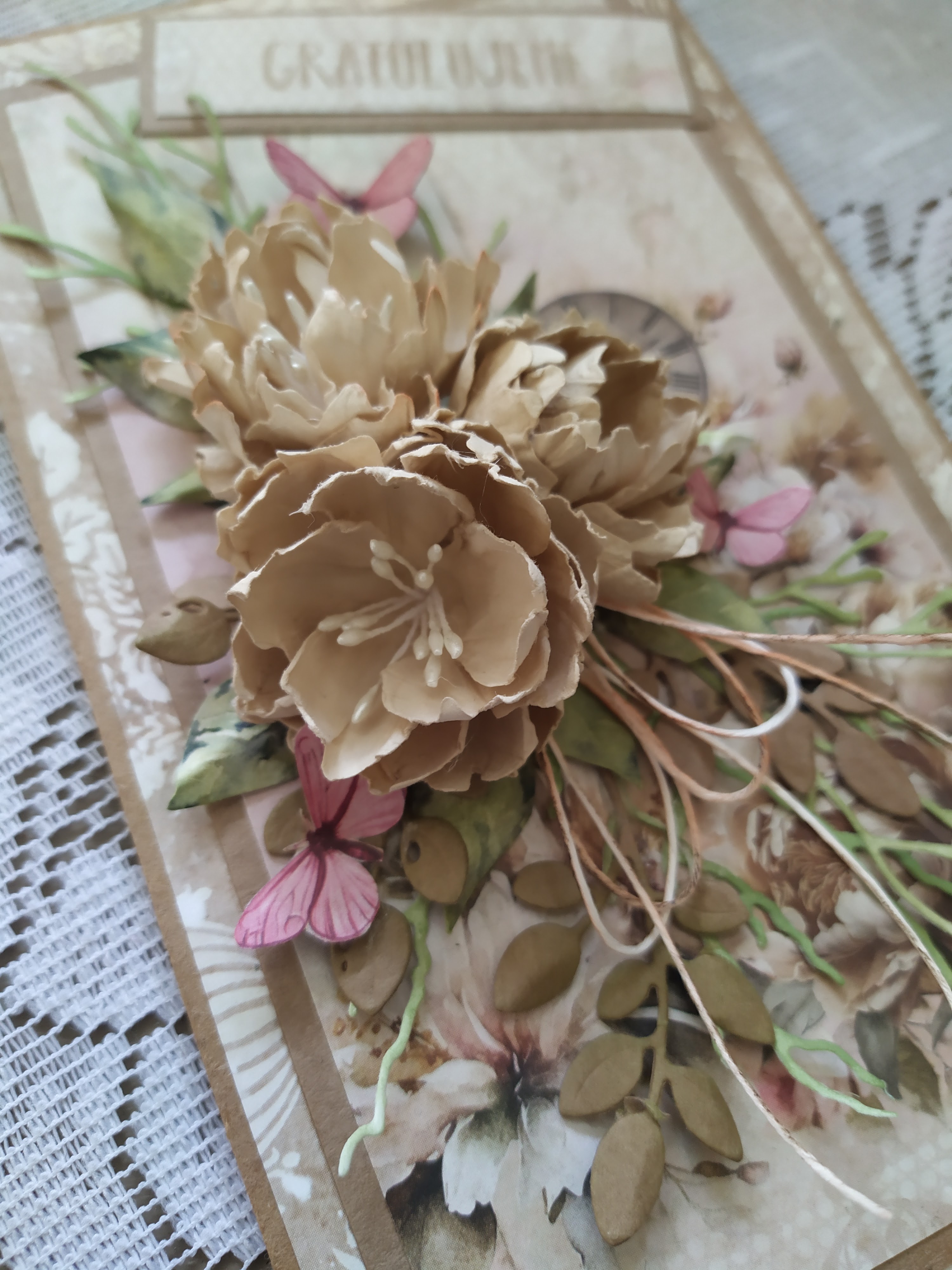 a hnedou pečiatkovou farbou. Ružové motýle vytiahli celú kompozíciu.